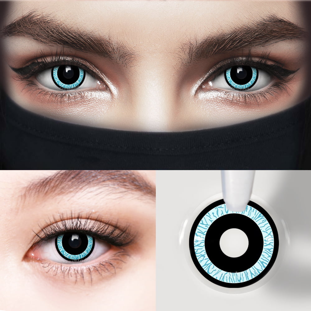 Freak out your style with these Nebula Contact Lenses. These scary contact lenses block out your natural eye color with black and place a Blue ring around your iris. The result is really dramatic and scary, perfect for Halloween costumes or a statement look.